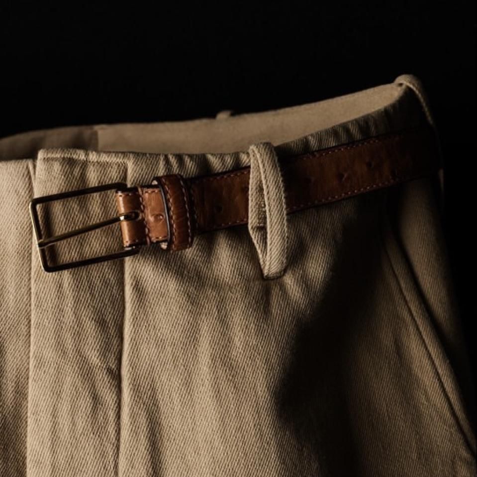 本来あるはずのものがITS GONE。ベルトループも叩かずTURN OVERする珍しい仕様に作り替えております。シルエットはストレート、パイプラインです。素材はコンセプト安見え、痩せくたった生地を表現するために甘く撚られた糸を使用してなるべくTWILL目が立つ組織で作製した生地。シルケットをかけずにラフに染色し、さらに加工を施してます。