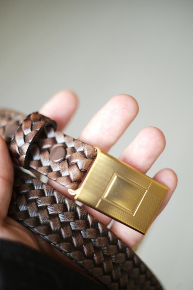 LOT.003 Hickok Beltと同じオリジナルの真鍮製ローラーバックルを使用し、新たに凹凸が美しい籠目のような編み模様を採用した一本。