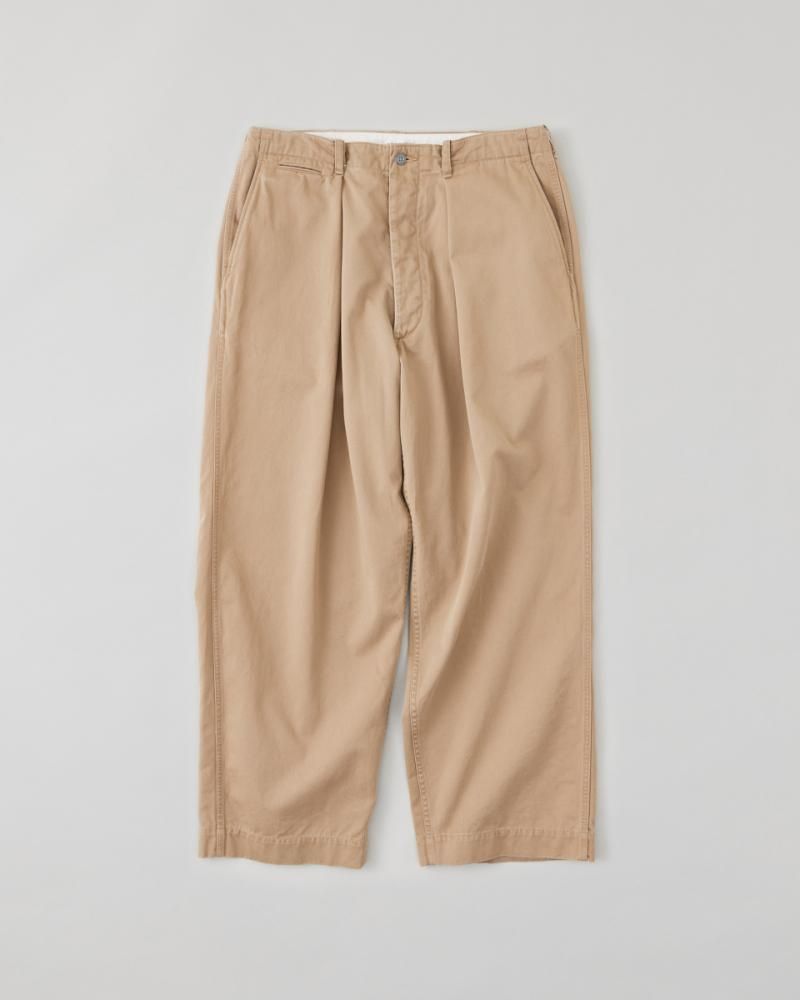 1950〜60年代のミリタリーチノをイメージして織り上げた特注のチノクロスに、特殊な加工を施してヴィンテージライクに仕上げたトラウザー。1940年代のミリタリーチノをベースに、ウエストで折り返してタックを作るなどの再構築を加えた独自のパターンを採用。エイジング加工を施すことで、生地に柔らかさと膨らみが加わり、豊かな表情を持たせています。