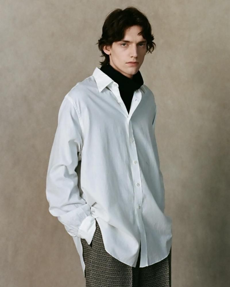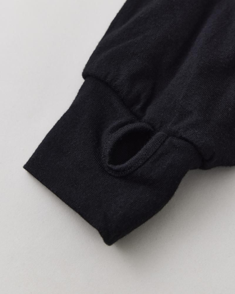コットンにカシミヤをブレンドしたビスポークの⽷を使⽤した上質なルーズモックネック L/Sシャツ。デザインは1980年代のUKロイヤルネイビーのルーズネックロングスリーブTシャツと、1990年代のUSカデットジャージーの仕様やカッティングをリファレンスとしています。ネックは⿐まで覆い被せることができる高さに設定、袖⼝にはサムホールを取り⼊れています。肌触りの良いコットンにカシミヤのふっくらと 柔らかなタッチが加わった⾵合いが特徴です。