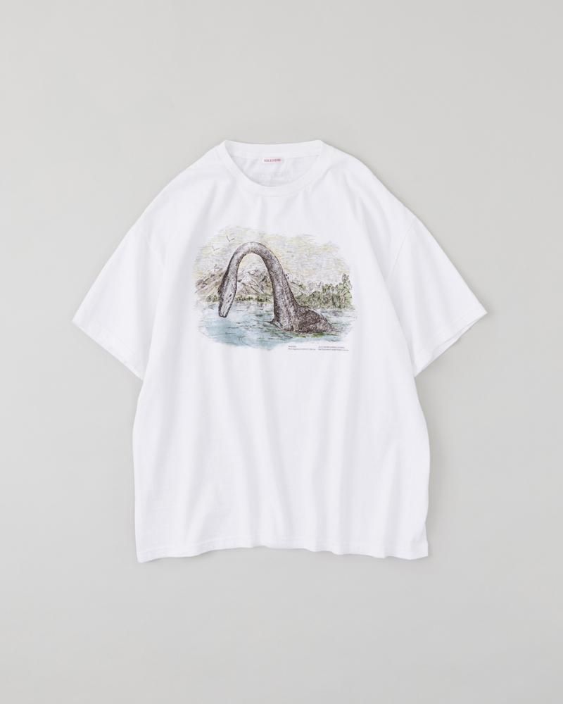 UMA(未確認動物)をモチーフにしたグラフィックをプリントした、6.0ozのヘビーウェイトTシャツ。1980〜90年代のアメリカ製アニマルプリントTシャツをイメージソースに、色ごとに版を分けて重ね刷りすることで、ヴィンテージプリントのような奥行きのある表情を表現しています。目の詰まったタフな生地感と、USコットン特有のざっくりとした素材感も魅力の一つ。ネッシー、ビッグフット、ツチノコという3種のUMAを、どこか懐かしいユーモアとともに描いています。