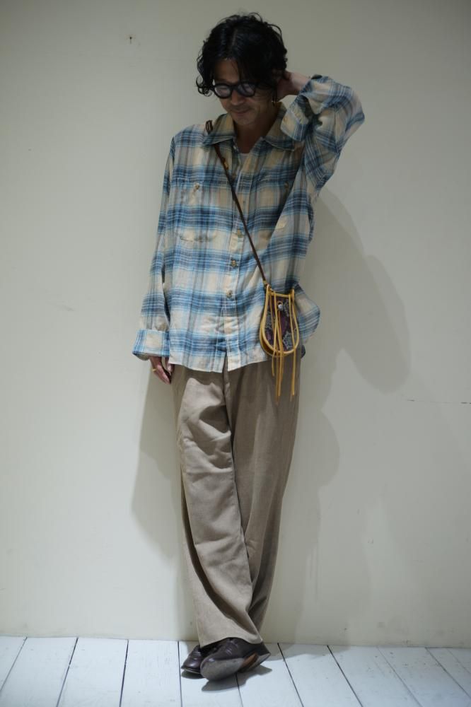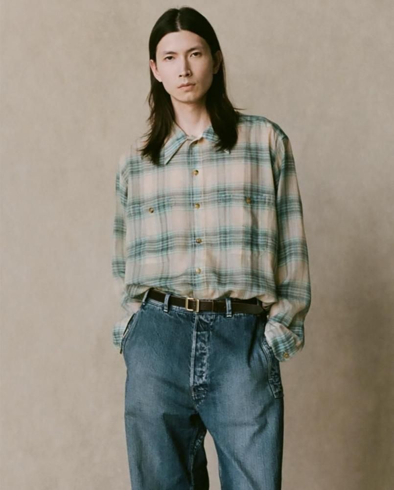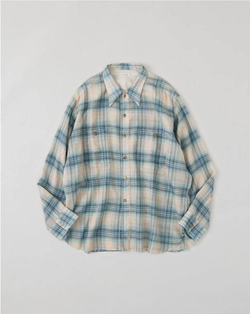 極細のウール糸を使用し、縦8色、横5色の計13色で構成されたアメリカの風景に馴染むようなムードを目指して制作したビスポークのオンブレチェック生地を用いたワークシャツ。1920〜30年代の古き良きアメリカのワークシャツをベースに、ディテールや縫製にインドならではの手仕事を加えることで、立体感のある仕上がりに。チェーンステッチを手作業で入れる仕様が、控えめながらも存在感を放ちます。