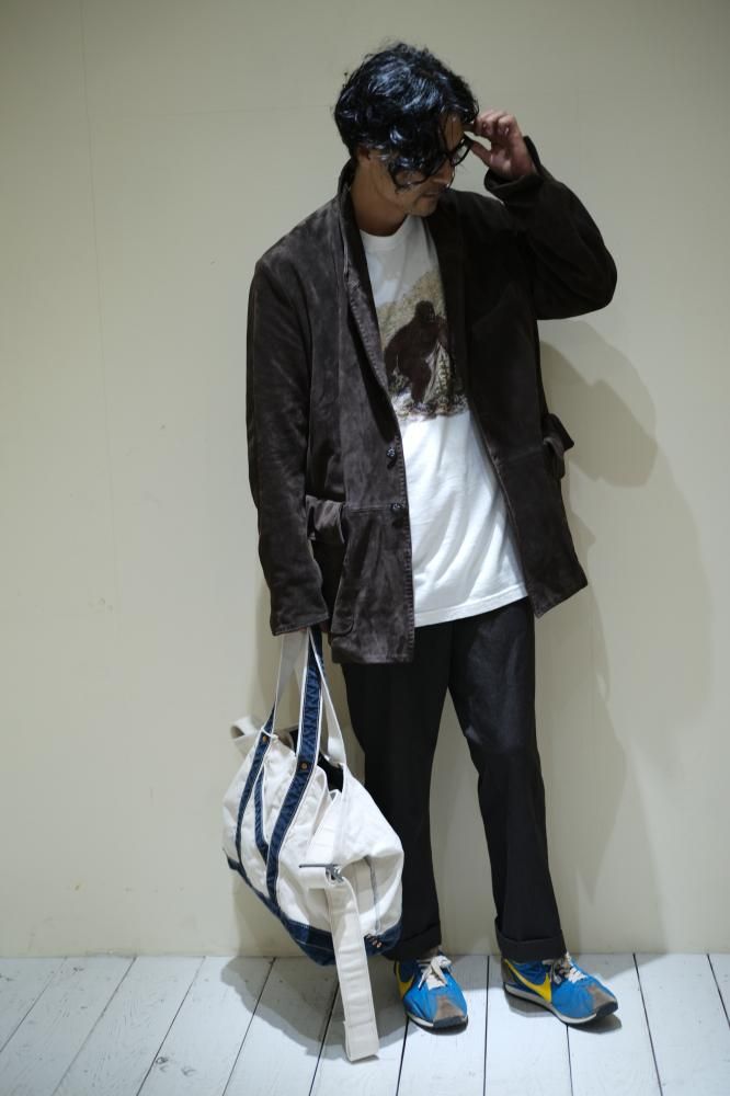 イタリア・トスカーナのタンナーが手掛けた上質なカウスエードを使用したハンティングジャケット。ビロードのような美しい毛足と、繊細なディテール、クラシカルなビスポークボタンが印象的です。スペインのテバ伯爵が英国サヴィル・ロウで仕立てたとされるテバジャケットを、1990年代のハリウッド俳優が着ていたレザージャケットを重ね合わせるように、アメリカ的な感覚で再構築しました。英国とスペインのクラシックな要素に、アメリカのムードが交差する一着です。